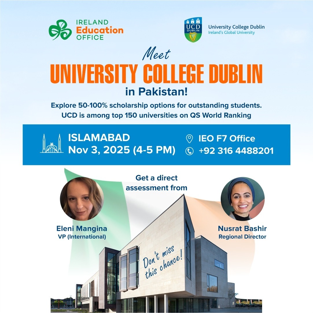 Get a direct assessment from Professor Eleni Mangina & Ms Nusrat Bashir and explore 50–100% scholarship opportunities for outstanding students at UCD, ranked among the top 150 universities worldwide (QS World Rankings). Learn more about our in-demand Master’s programs in Technology, Artificial Intelligence, Medical Physics, and Data Science. For any information, feel free to contact: +92 316 4488201 | +92 308 8881287.